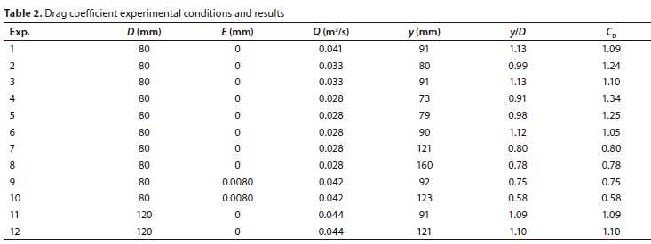 The experiments to determine the drag coefficient on the exposed spheres were carried out in a 0.90 m wide horizontal flume. The bed was prepared in the same way as for the incipient motion experiments, except that the test sphere did not rest on supporting spheres but was suspended just clear of them. The drag force was measured by means of moment equilibrium. The test sphere was attached to a rod, which pivoted about a pin, inducing a force measured on a tension sensor placed above the pin. Details of the apparatus and its calibration are described by Stols (2018) and Jackson (2016). Discharge (Q) was measured using the inline flow meter as well as volumetrically in the sump at the end of the flume; the water level was controlled by a weir at the end of the flume and measured at the test location using a digital point gauge. Twelve boulder conditions were tested, 10 for an 80 mm diameter sphere, including two embedded cases, and two for a 120 mm diameter sphere. Relative depths ranging from 0.65 to 1.83 were tested. The conditions are listed in Table 2. The sphere Reynolds number (Re = VD/v, where V is the ambient depth-averaged velocity and V is the kinematic viscosity of water) was in the range 9.2 x 104 to 1.65 x 105, within which CD would be expected to be practically independent of Re.