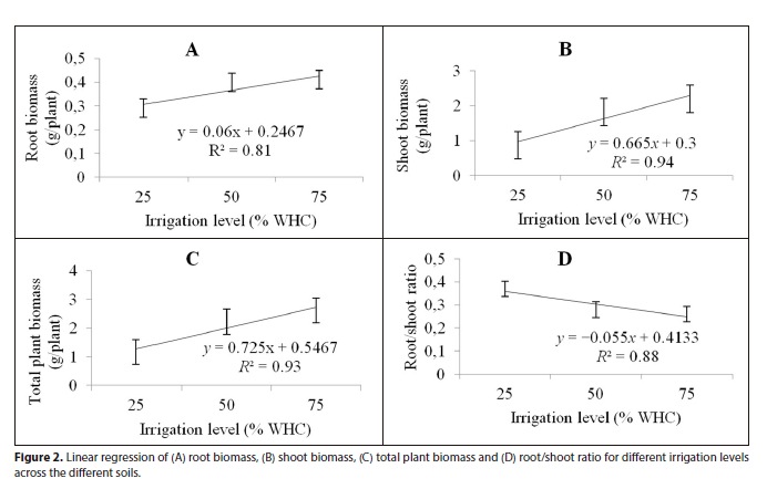 The 25% WHC treatment reduced SBM by up to 68% as compared to the 50% and 75% WHC treatments in SL soil (Fig. 3A). Even though the differences in RBM amongst the different irrigation levels were insignificant, the RBM increased correspondingly with the irrigation level in SL soil (Fig. 3B). The TBM obtained from the 25% WHC treatment was 65% lower than that recorded from the 75% WHC treatment in SL soil (Fig. 3C). The RSRs obtained from the irrigation treatments in LS soil were significantly higher than those from irrigation treatments in SL soil (Fig. 3D), indicating that irrigation treatments favoured root growth over shoot growth more under LS soil than SL soil. This result is different from that reported by Souza et al. (2016), who showed that irrigation promotes greater growth of plants in soils of a medium texture with high clay content compared to sandy soils with low clay content.