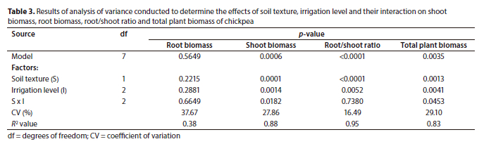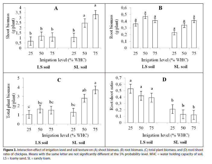 Chickpea productivity was studied under varying irrigation levels (25%, 50% and 75% of soil WHC and soils (sandy loam soil (SL) and loamy sand (LS) soil). The results revealed that shoot biomass (SBM), total plant biomass (TBM) and root/shoot ratio are affected by irrigation level, soil texture and their interaction. However, further studies that assess the influence of irrigation level, soil texture and their interaction on chickpea performance up to the point of grain harvest are needed. The use of 25% irrigation level is discouraged as it leads to SBM and TBM losses compared to 75% irrigation level in SL. The SL soil gave higher SBM and TBM as compared to the LS soil; therefore, soil texture should be considered when selecting a production site for chickpea. Lastly, the results showed that maintaining the soil moisture at 50% WHC may ensure better production of chickpea dry matter under the SL soil.