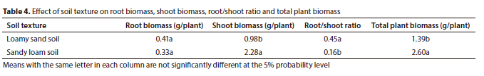 Shoot biomass and TBM were significantly higher in SL with high clay content (16.67% clay) and high WHC than in LS soil with low clay content (8.83% clay) and low WHC (Table 4). The greater SBM and TBM observed in SL soil than in LS soil may be ascribed to the higher WHC of this soil (Souza et al., 2016). This finding is in line with that of Ogola et al. (2021), who reported that the above-ground biomass and grain yield of chickpea were quantitatively higher in high clay content soil (clay-textured soil) than in soil with low clay content (loamy sand-textured soil). On the contrary, Moloto et al. (2018) found that 4 out of 5 desi-type chickpea genotypes had greater plant growth in sandy loam-textured soil than in the clay-textured soil. High values of SBM and TBM in SL soil may be attributed to the sandy loam soil's good water retention capacity (Purushothaman et al., 2017), nutrient retention and permeability, as well as its higher clay content, which provide good soil structure and fertility (Molepo et al., 2017). Conversely, the dry roots of plants from pots with LS soil were generally (24.24%) heavier than the dry roots of plants from pots with SL soil (Table 4). A study by Ahmadi et al. (2011) also showed a significantly higher potato root dry matter in loamy sand soil compared to sandy loam soil. Significantly higher RSR (Table 4) in the LS soil than in the SL soil indicated that the conditions of LS soil allowed plants to allocate higher proportions of biomass into roots, possibly due to increased competition for soil resources (Qi et al., 2019). Soils with high clay content, such as the SL-textured soil used in this study, may also have a temporary mechanical impedance that limits root growth when the soil dries out (Cairns et al., 2004; Whitmore and Whalley, 2009; Ahmadi et al., 2011; Bengough et al., 2011). The loamy sand-textured soil on the other hand has a high permeability due to its coarser texture (Molepo et al., 2017), which has been shown to promote root growth (Ahmadi et al., 2011).