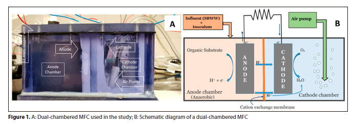 Effluents from food industry are rich in dissolved organic matter, especially simple carbohydrates, and they need an expensive compliance treatment process before discharging to adjoining water sources (Zheng et al., 2013). The processing effluents of the sugarbeet industry are no exception. An older sugarbeet processing industry typically uses 25-45 L of water per 100 kg of fresh beet water per day, with wastewater production at a nearly equal rate (Vaccari et al., 2005). There is a need to treat the wastewater before discharging it (Rahman et al., 2018). This sugarbeet processing wastewater (SBWW) can be a valuable substrate for generating bioelectricity using microbial fuel cells (MFC), since it is rich in organic matter and contains some nutrients. MFC is a promising process that can generate bioelectricity by oxidizing wastewater organic matter using exoelectrogens (Logan, 2008). MFC can be a viable treatment option for treating SBWW to reduce pollutants as well as generate bioelectricity. Exoelectrogens are electrochemically active bacteria that act as biocatalysts in MFC by oxidizing organic substrates in an anaerobic anode compartment, transferring electrons, and consequently helping to generate electricity from wastewater (Rahimnejad et al., 2015). In addition, MFC-treated wastewater can also be recycled.