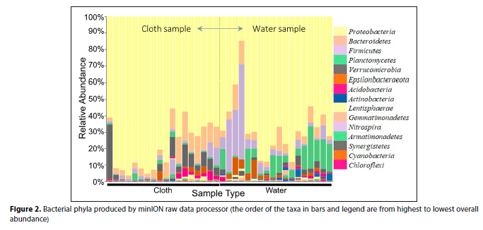 In this study, 16S rRNA gene analysis was performed for all 9 post-experiment cloth samples. A total of 918 723 sequence reads were obtained from the analysis produced by the minION raw data processor. Operational taxonomic units were classified to the genus level (Fig. 2) and alpha and beta diversity were compared between pH and cloth and water samples of the anodes.