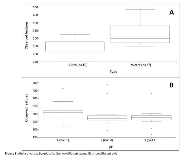 Alpha diversity is a measure of the taxonomic diversity within samples. The cloth anodes contained fewer observed OTU than the water samples, and this taxonomic richness was significantly different (Fig. 3; Kruskal-Wallis test, p < 0.05). Evenness and the Shannon-Weaver index were not significantly different between cloth and water. Alpha diversity did not differ between the three different pH levels, though observed OTU quantities were lower at pH#2 (8.6±0.1) and pH#3 (9.5±0.1) than at pH#1 (6.5±0.1) (Fig. 3).