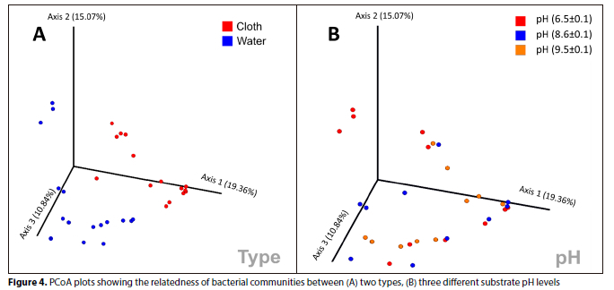 Community composition differed significantly between pH levels and between sample types (cloth vs. water; Fig. 4). Composition differences based on Bray-Curtis dissimilarity between cloth and water microbiomes explained approx. 13% of the variation between communities based on Permanova analysis (p < 0.05), and pH explained approx. 6% of variation in community composition ( p < 0.05). Consistent with the Alpha diversity analyses, dissimilarity among water samples was greater than dissimilarity among cloth samples.