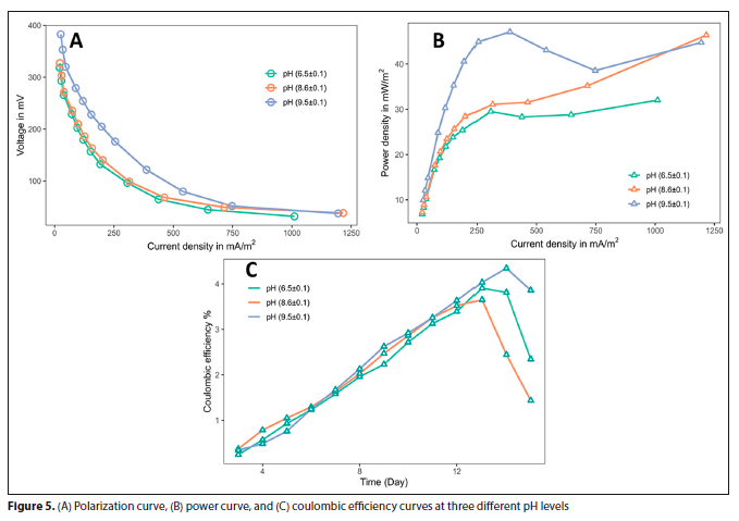 Polarization curves and power curves were created using the data observed, by applying various external resistances. Figure 5 illustrates the polarization curves and power curves for all three substrate pH levels; pH#3 (9.5±0.1) produced higher voltage and current density than the other two pH levels. The cell voltage and current density were inversely proportional - cell voltage gradually decreased with an increase in current density. When external resistance increases, the reactor produces a lower current density because current is inversely proportional to the resistance. Similarly, lower external resistance produces higher current density. The highest cell voltage of 382.7±26.6 mV was obtained at 4 700 Ω external resistance at pH#3 (9.5±0.1), while a similar external resistance at pH#1 (6.5±0.1) and pH#2 (8.6±0.1) produced 318.3±44.6 mV and 327.4±19.4 mV, respectively.