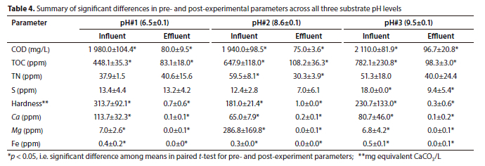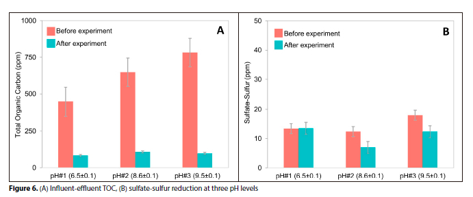 In terms of pollutant removal from the substrate, regardless of substrate pH, around 99% of COD, 99% of hardness, and 93% of iron were observed to be removed in this study. However, bacterial activity slowed down in an acidic environment and increased with increased substrate pH. As a result, the highest reductions in TOC (83%), TN (22%), and sulfate-sulfur (50%) were noted at pH#3 (9.5±0.1).