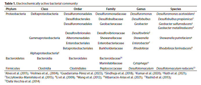 Research indicates that the performance of MFC is closely linked to the pH of the anolyte. For instance, in studies where weakly acidic to strongly alkaline anodic pHs (ranging from 6.0 to 10.0) were used, Puig et al. (2010) achieved the highest power production (0.66 W/m3), effective organic matter removal (77% COD removal) and ammonium reduction at pH 9.5. Similar observations were noted when researchers adjusted both the anodic (alkaline) and cathodic (acidic) pH values. Operating with an anodic pH of 10.0 and a cathodic pH of 2.0 suppressed methanogenesis, resulting in the MFC achieving a higher open circuit voltage (1.04 V) and maximum power density (29.9 W/m3) compared to operation at neutral pH (Zhuang et al., 2010). Studies on MFC performance investigating variations in anolyte and/or catholyte pH have shown that alkaline anodic conditions were conducive to higher electricity generation and pollutant reduction. However, very few studies have conducted microbial analysis specifically focusing on anodic pH variations. Similarly, limited studies have specifically examined the performance of microbial communities while simultaneously assessing the effectiveness of treatments for bioelectricity generation and pollutant reduction. The efficacy of MFC significantly depends on the activity of exoelectrogens. Not all microbial communities have electrochemical activity, and therefore it is necessary to identify what kind of microorganisms are present in the substrate and contribute to bioelectricity generation. Microbial community analysis of the exoelectrogens associated with MFC showed a great range ofbacteria are capable of anodophilic electron transfer, i.e., the capacity for electron transfer to an anode (Logan et al., 2006). Further bacterial taxonomy studies focusing on electricity generation from MFC noted that Proteobacteria (Jung and Regan, 2007) and Bacteroidetes (Zhang et al., 2009) are the two broad bacterial phyla that are electrochemically active and account for electricity generation in MFC. Especially, different classes, families, genera and species of Proteobacteria, Bacteroidetes and Firmicutes are thought to be particularly active in electricity generation (Table 1).