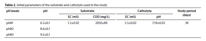 The study confirmed that MFC is highly effective in COD reduction from SBWW. The initial COD of the substrate was 2 050±89 mg/L for all three pH levels. At the end of the study, about 99.5, 99.8, and 99.0% of substrate COD were reduced at pH#1 (6.5±0.1), pH#2 (8.6±0.1), and pH#3 (9.5±0.1), respectively. This result is supported by that of other studies using a similar substrate (e.g. Ahn and Logan, 2010; Rahman et al., 2018). However, the current study suggested that substrate pH has no specific effect on substrate COD removal. Compared to other published studies, the current study demonstrated greater COD removal from the substrate (99%). While working with a dual-chamber MFC, Rahman et al. (2018) noted 89.5% substrate COD removal (initial substrate 1 000 mg/L) and Ahn and Logan (2010) achieved 88% substrate COD removal (initial substrate COD 800-900 mg/L).