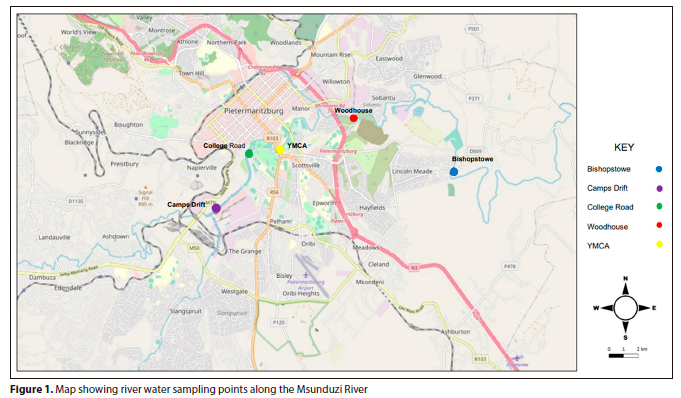 Tap water samples were obtained from Richmond Crest, Mkhondeni, Woodlands, Boughton and Scottsville, suburbs in the Pietermaritzburg area. River water samples were collected along the Msunduzi River, at Bishopstowe, College Road, Camp's Drift, Woodhouse, and YMCA (Fig. 1) Wastewater samples were obtained from three wastewater treatment plants (WWTPs) in the city of Durban: Amanzimtoti, Umhlathuzana and Northern. In all WWTPs, water samples were taken in the influent, the effluent and liquid sludge. The Umhlathuzana WWTP receives influent from Marianridge and Shallcross which are then combined into one effluent after treatment, and discharged into the Umhlathuzana River. Amanzimtoti WWTP discharges into the Mbokodweni River; Northern WWTP discharges into the Mgeni River. River water samples were taken from the rivers where the WWTPs of interest discharge their effluent. About 2.5 L of water was collected in polyethylene bottles and immediately placed in a portable ice chest. Samples were transported to the laboratory and filtered using a 0.45 μm membrane filter consisting of biologically inert mixtures of cellulose acetate and cellulose nitrate (Merck, Darmstadt, Germany).