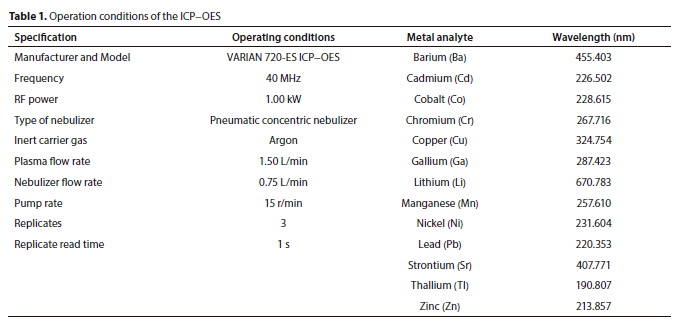 The sample digestion was performed using Multiwave 5000 (Anton Paar, Johannesburg). The Varian 720-ES ICP-OES (inductively coupled plasma-optical emission spectroscopy) was used for the determination of metals in water samples. The instrument operated at a frequency of 40 MHz and RF power of 1.00 kW, and consisted of a pneumatic concentric nebulizer with a flow rate of 0.75 L/min and a pump rate of 15 r/min. The inert carrier gas used was argon (Ar), with a plasma flow of 1.50 L/min. Three replicates were read, with a replicate read time of 1 s. These conditions remained constant throughout the analysis. Table 1 summarizes the conditions and optimal wavelengths used for each metal element.