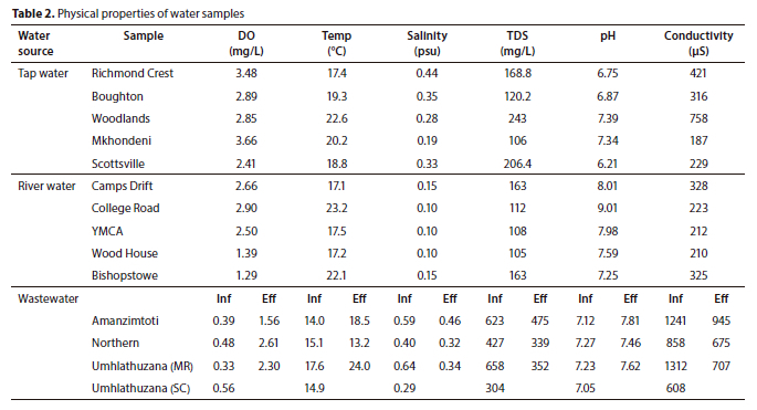The DO levels in tap water ranged from 2.41-3.66 mg/L, in river water from 0.64-2.90 mg/L and in wastewater from 0.33-2.61 mg/L. The presence of organic and or inorganic material in water depletes oxygen. For example, Fe2+ can deplete oxygen via oxidation to form Fe3+ (Reeve, 2002) and oxidation processes can be a possible explanation for the differences between the DO levels in tap and river water samples. Oxidation processes are used in treatment of drinking water, thus increasing DO levels. Therefore, tap water is expected to have higher DO levels compared to river water since microorganisms will significantly decrease DO (Li et al., 2013). Salinity in wastewater ranged from 0.29-0.64 psu and was higher than that of river water (0.10-0.15 psu) and tap water (0.19-0.44 psu). Conductivity of tap, river and wastewater samples ranged from 187-758 μS, 210-888 μS, and 608-1 312 μS, respectively. The maximum allowable limit of conductivity in water as per the NDWQS guidelines (Rahmanian et al., 2015) is 1 000 μS.