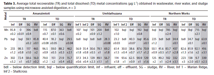 There was no trend observed between total recoverable and total dissolved metal concentrations in wastewater (Table 3). Co and Li concentrations were found to be higher in influent samples, while they were either below quantification or detection limit in the corresponding effluent samples, indicating their partial removal by the WWTPs. Mn was present in all sludge samples (192-785 μg/L) and higher concentrations were observed for total recoverable than total dissolved Mn. This could be due to the fact that liquid sludge contains some solid particles which can increase the adsorption of Mn and, since total recoverable determination includes dissolved and suspended metals, high concentrations are expected (Addo-Bediako et al., 2018). Ni was only quantified at the Amanzimtoti WWTP influent for total recoverable and total dissolved (118.9 and 235 μg/L). It was below the quantification limit in the effluent and other samples - an indication of efficient removal of Ni at the Amanzimtoti WWTP. Pb, Sr, and Zn concentrations were quantified in all waste and corresponding river water samples (where WWTPs discharge), and were found to be below the maximum permissible limits, with the exception of Pb. The highest Pb concentration was found at the Northern River WWTP for both total recoverable and dissolved determinations. Amanzimtoti WWTP had higher Zn concentrations in the effluent for total dissolved determination. This might be due to particulate Zn in the influent being transferred to the aqueous phase in aeration tanks used in the WWTPs. Also, a higher amount of metals in the activated sludge may be transferred to the aqueous phase in aeration tanks which might increase the amount of Zn present in the effluent (Yamagata et al., 2010). Co was detected in Amanzimtoti influent and sludge at 37.4 μg/L and 28.6 μg/L, respectively, as well as in Northern Works influent and sludge at 37.6 μg/L and 40.7 μg/L, respectively. Li was detected in Amanzimtoti influent and sludge at 13.9 μg/L and 20.3 μg/L, respectively, and in Northern Works sludge (17.6 μg/L) and Umhlathuzana influent (7.3 μg/L). Lastly, Cd, Cr, Cu, Co, Li, Ni, and Tl were below detection or quantification limits.