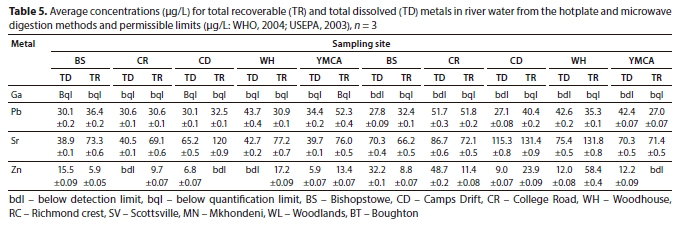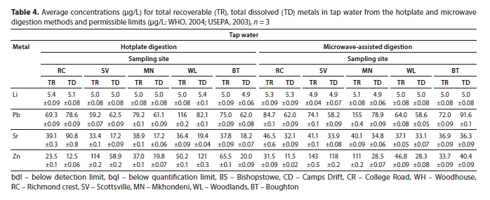 The average concentrations observed for total recoverable metals were much higher than for total dissolved metals in tap and river water (Table 4 and 5). This was expected since the total recoverable metal concentrations consider the soluble and insoluble metals (unfiltered samples) whilst the total dissolved metal concentration only considers the soluble metals as particulates (insoluble) are removed by filtration (USEPA, 1994). However, some metals had higher total dissolved compared to total recoverable concentrations, especially when using microwave digestion. This could be due to the microwave method being a closed-system digestion, which, apart from a considerable reduction in digestion time, also results in minimal sample contamination and loss of volatile metals such as As, Hg, and Cr (Sastre et al., 2002). In tap water, Li concentrations were approximately the same (4.95.5 μg/L) for all samples for both digestion methods, whereas for river water, Li was only quantified in Woodhouse River water (34.5 μg/L) using the microwave digestion method. There is no maximum permissible limit set for Li in drinking water; however, the obtained values were below the oral reference dosage which is 700 μg/L (USEPA, 2003); hence the analysed tap water can be assumed to be safe for consumption. Li has also been detected in tap water at 20-160 μg/L and 0.7-59.0 μg/L from Texas and Japan, respectively (Ohgami et al., 2009), and the maximum concentrations were higher than those obtained in this work. The highest concentration obtained for Sr was 90.8 μg/L (Richmond Crest) which is lower than that reported in drinking water from China (1 690.0 μg/L) by Zhang et al. (2018).