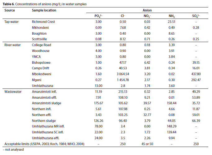 Chloride concentrations were found to be below the maximum acceptable values, except in the Amanzimtoti and Northern River water samples. Scottsville tap water had the highest chloride level of all tap water samples (8.12 mg/L), but this was still below the maximum allowable limit. Chlorides are expected to be present in tap water since chlorination is used in water treatment. In river water, the highest concentration above the maximum limit was found in Amanzimtoti (3 064.54 mg/L), which was higher than that observed at the Sakarya River in Turkey (78.52 mg/L) (Altundag et al., 2019). The chloride concentration in the river water could be due to natural sources such as weathering of rocks and concentrations can increase because of evaporation.