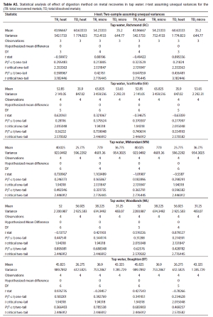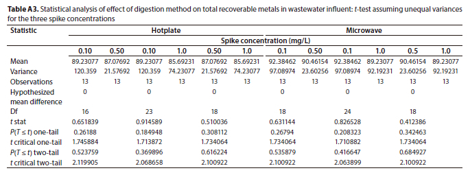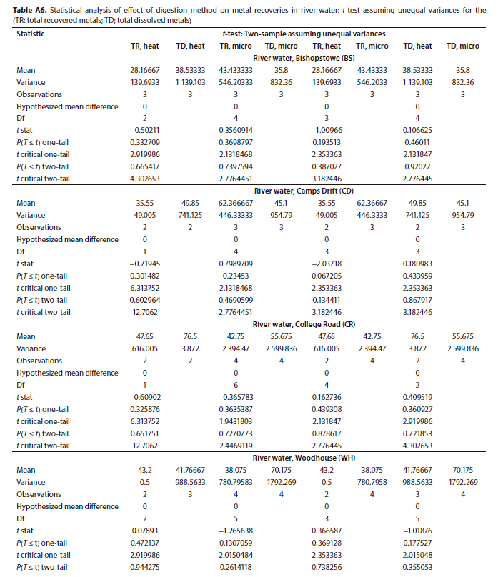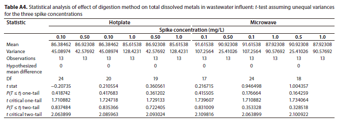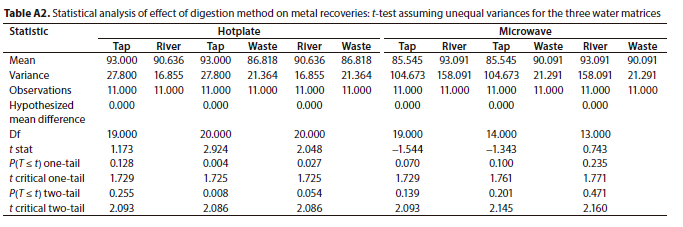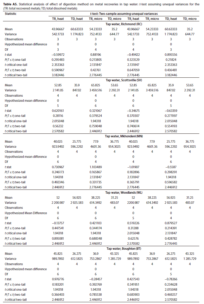 However, it was also observed that for some metals the total dissolved recoveries were higher, and this could be due to the sample reduction step in the total recoverable determination where the analyte is lost via evaporation during the heating process (Sastre et al., 2002). A t-test showed that the mean recoveries were not significantly different at the 5% level (Table A2).