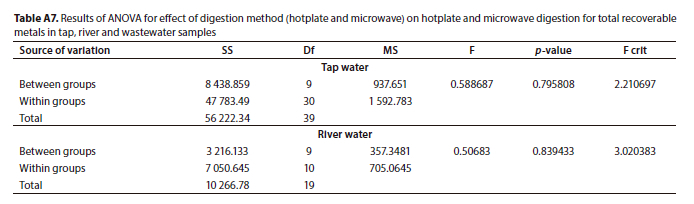 For both digestion methods, statistical analysis showed that the concentrations obtained were not significantly different (Table A6). In addition to the í-test, a one-way ANOVA was conducted on the two digestion methods which revealed that there is no significant difference between the methods as Fcritical > Fvalue with p > 0.05 (Table A7). It can be concluded that the hotplate method can be recommended for daily routine analysis as it is a cheaper technique compared to microwave-assisted digestion. The reason for the differing concentrations of heavy metals in water samples is that despite the assumption that applications are the same in nearly all countries, consumption patterns for chemicals may be different. For instance, some applications that may have been phased out in some countries may be widely used in other countries resulting in the presence or absence of certain heavy metals in water systems (Olujimi et al., 2012).