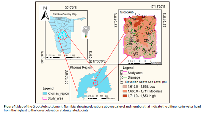 The Groot Aub village settlement is situated at a latitude of 22.9423° S, and longitude of 17.2031° E in the central part of Namibia (Fig. 1), approximately 55 km south of Windhoek, Namibia's capital city. The village is situated at a ground elevation of 1 647 m above mean sea level. The mean precipitation in Groot Aub is about 220 mm/yr (Mohd et al., 2016). The settlement experiences maximum temperatures of up to 34°C in summer and minimum temperatures of up to 4°C in winter (Meteoblue Weather, 2021).