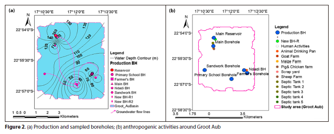 The Groot Aub (GA) settlement depends entirely on groundwater for domestic purposes and other development activities. Development activities are mainly agriculture, such as animal husbandry, chicken farming and crop farming using irrigation. However, these activities have the potential to contaminate the groundwater system. A total of 87 groundwater samples were collected from the boreholes in the study area during the dry and wet season. Water quality parameters (pH, salinity, total dissolved solids (TDS), electrical conductivity (EC) and hydrochemistry (Na+ > Ca2+ > Mg2+ > K+, and HCO3- > SO42- > Cl-) of 5 boreholes and 1 reservoir tank were analysed. The dominant cations were attributed to cation exchange processes as a coupled exchange of Na+ + K+ replacing Ca2+; and Na+ replacing Mg2+ ions in the rock-water interactions. The HCO3- anion is attributed to underlying rich carbonate rocks in the study area and chemical reactions between groundwater and silicate minerals. TDS ranged from 639.01 to 1 998.96 mg/L. The microbial levels as indicated by heterotrophic plate count (HPC) values exceed the limits imposed by the local Namibian and WHO drinking water regulations. The Piper diagrams showed a mixed water type of mainly HCO3- and SO42-anions and Na+ and Ca2+ > Mg2+ cations. The study shows that the elemental composition of the groundwater is impacted significantly by primarily anthropogenic activities and secondarily geogenic processes. Based on the results of this study it is recommended that a buffer zone be created between human activities and production boreholes to avoid further groundwater contamination.