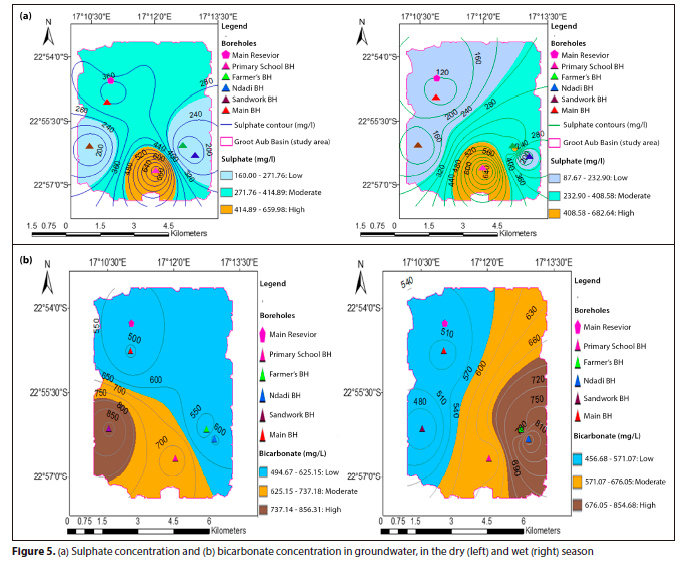 In the dry season, SO42- concentrations were highest in the same areas as TDS, in the southern part of Groot Aub, with the highest values ranging from 414.89-659.98 mg/L (Fig. 5a). In the wet season, SO42- concentrations increased slightly, to a maximum of 682 mg/L (Fig. 5a). This increase in sulphate values reflects geogenic effects due to dissolution of mineralised sulphide-rich carbonate rocks in Groot Aub. Concentrations ranged from 408.48-682.64 mg/L in the southern part of Groot Aub (Fig. 5a), reflecting the trend in TDS and EC (Fig. 3b and 3c). Moderate SO42- concentrations were observed in the central part of the region, at 232.90-408.58 mg/L (Fig. 5a). The lowest concentrations were recorded in the north-west with values of 87.67-232.90 mg/L (Fig. 5a). The WHO recommends a sulphate value of 250 mg/L, with a maximum permissible limit of 400 mg/L.