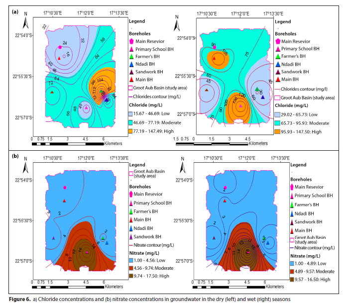 In the dry season, the highest Cl- concentrations were recorded to the east (Fig. 6a), with intermediate values across most of the area, except the northwest and a small area in the south that both show very low values (Fig. 6a). High Cl- concentrations during the wet season were restricted to the areas surrounding the Groot Aub Primary School Borehole in the south and the Main Borehole in the north (Fig. 6a). These areas show a range of Cl- concentrations from 95.93-147.50 mg/L. Intermediate values (65.73-95.93 mg/L) occur widely across the study area (Fig. 6a). The lowest values (29.02-65.73) occur to the west and east (Fig. 6a).