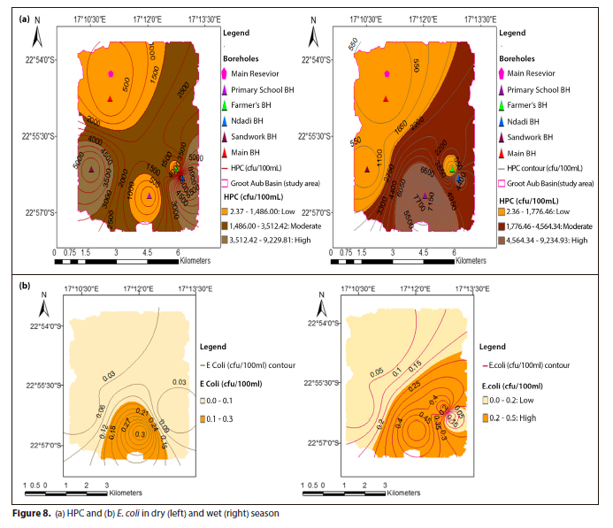 Heterotrophic plate count (HPC) values are a measure of the total bacterial load in water expressed as the growth of bacteria per 1 mL. The study recorded extremely high values for HPC, above the permissible values in both the wet and dry season, at up to 9 224.7 CFU/mL and 4 500.09 CFU/mL, respectively (Fig. 8a). The Namibian Water Guideline limits HPC to 100 CFU/mL for Group A and 1 000 CFU/mL for Group B, while WHO limits HPC to 100 CFU/mL. In the dry season, HPC showed a maximal central distribution, with the area to the north-east and a smaller area to the south not being greatly affected. In the wet season, the water flows from the north toward the southeast, ensuring migration (similar to bicarbonate) of the high HPC values toward the boreholes in the south-east. This movement induces contamination of the boreholes in the south-eastern part of Groot Aub, which is anthropogenic in origin, with the Groot Aub Primary School Borehole being a major concentration point (Fig. 2b, 5a, 6b, 8a and 8b).