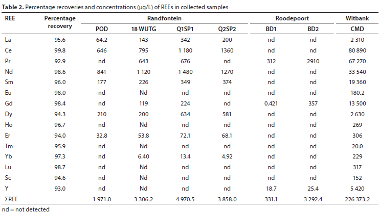 The analysed CMD sample was found to have a lower pH value (2.37) than the AMD from gold mines, with pH values ranging from 3.01 to 5.53, as reported in Table 1. The CMD sample was therefore more acidic than those from Malan and Sitai coal mines in Shanxi Province, China (2.99-7.82) (Sun et al., 2012). The high pH values for samples from gold mines (Table 1) could be justified by the neutralisation processes that are initiated at the mine as remedial action to reduce the acidity of the AMD prior to disposal. The AMD is neutralised with lime to a targeted pH of 7. This might affect the concentrations of REEs in the AMD as they precipitate within a pH range of 3.3-9.3, depending on the alkali used and the specific REE (Khawassek et al., 2015).
