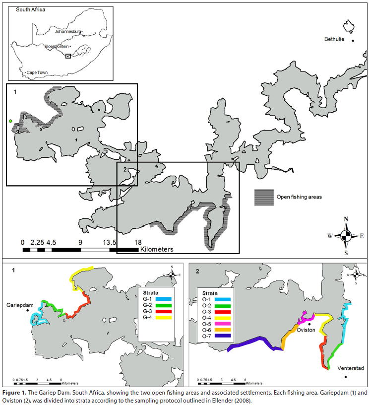 The Gariep Dam, also known as Lake Gariep, with a surface area of 360 km2 at full capacity is the largest impoundment in South Africa (DWS, 2019). The dam wall was completed in 1972, and the resulting impoundment is located across the borders of the Free State and Eastern Cape Provinces (30°37.24.5' S 25°30.35' E). Shoreline length varies from 400-528 km, depending on water levels (Hamman, 1981; Van Vuuren, 2012). Most of the extensive shoreline of the Gariep Dam is closed for fishing (approximately 87%), but designated fishing areas have been set aside by conservation authorities. The designated fishing areas comprise 25 km of shoreline in the Gariep Dam Nature Reserve and 27 km of shoreline in the Oviston Nature Reserve (Fig. 1). Access to some of the fishing areas is in close proximity to the towns surrounding the Gariep Dam and entrance is not controlled, but access to fishing areas within the two nature reserves is managed and recorded (PJ Swanepoel, pers. obs.).