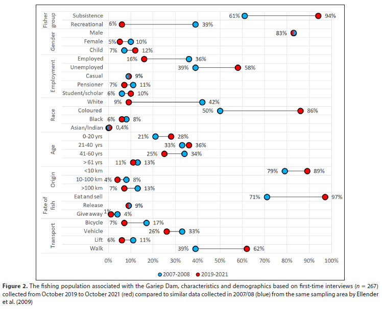 To describe the effect of the Covid-19 pandemic on the Gariep Dam fishery, fisher socio-demographic data derived from the current study were compared to that of Ellender et al. (2009) from surveys conducted between 2007 and 2008. The same metho dology was used for the current study and the 2007/08 study and the results were thus statistically comparable. The first major difference between the two studies was a change in employment of fishers. A marked decline in employed fishers was noted. There was also a marked decline in fishers representing the White race group with a significant increase noted in fishers representing the Coloured race group during the Covid-19 pandemic. It was also evident that 97% of fishers during the pandemic resorted to eating or selling their catch, compared to the historic data where only 71% of fisher catches were for subsistence use. A difference in the mode of transport was noted where the majority of the fishers walked to the fishing sites (62%), which was much higher than what was previously reported by Ellender et al. (2009) (Fig. 2).