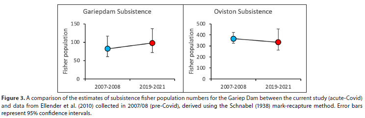 A comparison between the descriptive data for the current study (2019-2021) and the 2007/08 surveys indicates that a marked decline in recreational fishers was evident during the pandemic in both the Gariepdam and Oviston fishing areas (Fig. 2). However, the mark-recapture method recorded little difference in the subsistence fishing population for both fishing areas when the two studies are compared (Fig. 3).