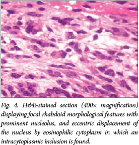 Pathological assessment confirmed the presence of a high-grade malignant neoplasm with foci of coagulative tumour necrosis and frequent mitotic figures. The architecture of the tumour varied from well-defined tumour cell nests to haphazardly distributed spindle cells. Some tumour cells displayed distinct rhabdoid morphology (Fig. 4) characterised by abundant eosinophilic cytoplasm with intracytoplasmic inclusions, eccentrically displaced vesicular nuclei and prominent nucleoli. Histopathological diagnosis of an atypical teratoid/rhabdoid tumour (World Health Organization (WHO) grade IV) was confirmed by diffuse immunoreactivity for vimentin (an intermediate filament), focal cytoplasmic and membrane staining with epithelial membrane antigen (EMA), and focal staining with smooth-muscle actin (SMA). Ki-67 immunohistochemistry revealed a high proliferation index of ~ 50%.