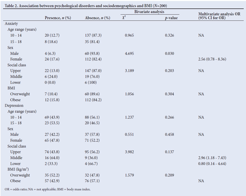 RESULTS. The mean age (standard deviation (SD)) of the 200 students included in the study was 12.9 (1.8) years. Most of the subjects suffered from depression (46%) and there was a significant association between anxiety and obesity in females (p=0.03), who were ~3 times more likely to be anxious than boys (OR 2.6; 95% confidence interval (CI) 0.78 - 8.36). Low self-esteem was also found to be closely associated with obese girls (p=0.002), who were about 3 times more likely to have a low self-esteem compared with males (OR 2.7; 95% CI 0.95 - 7.55). Obesity was stigmatised (p=0.002) and obese students were almost 5 times more likely to feel stigmatised than overweight students (OR 5.01; 95% CI 1.80 - 13.9).