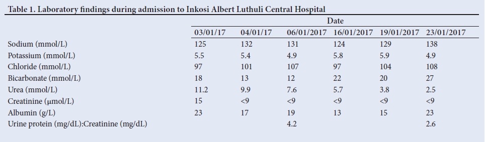 A 7-week-old female child born to non-consanguinous Mozambican parents presented at 3 weeks of age with poor appetite, skin lesions, anarsaca, severe hypoalbuminaemia (8.0 g/L), and anaemia (haemoglobin 9.2 g/dL). The child was born at term by normal vaginal delivery with a birth weight of 3.2 kg and Apgar scores of 8/10 and 9/10 at 5 and 10 minutes, respectively. The placental weight was not available. The mother had been booked at 24 weeks gestation and tested HIV-positive with a CD4+ cell count of 98 cells^L. Unfortunately, her HIV viral load was not available. She was initiated on fixed-dose combined antiretroviral therapy (cART) using ATRIPLA (efavirenz, emtricitabine (FTC) and tenofovir disoproxil fumerate) and the child was initiated on the elimination of mother-to-child transmission (EMTCT) programme using nevirapine (2 mg/kg for 6 weeks). The child was diagnosed with severe acute malnutrition and managed in accordance with World Health Organization guidelines. After a week, the oedema failed to resolve and she was initiated on daily albumin infusions for 6 days. Urinary dipstick analysis that was initially negative showed proteinuria of 3+ following albumin infusions and the urinary protein (mg/dL):creatinine (mg/dL) ratio was 3.0 (normal ratio <0.5), which was consistent with massive proteinuria. The child was subsequently referred to Inkosi Albert Luthuli Central Hospital (IALCH) in Durban for further management.