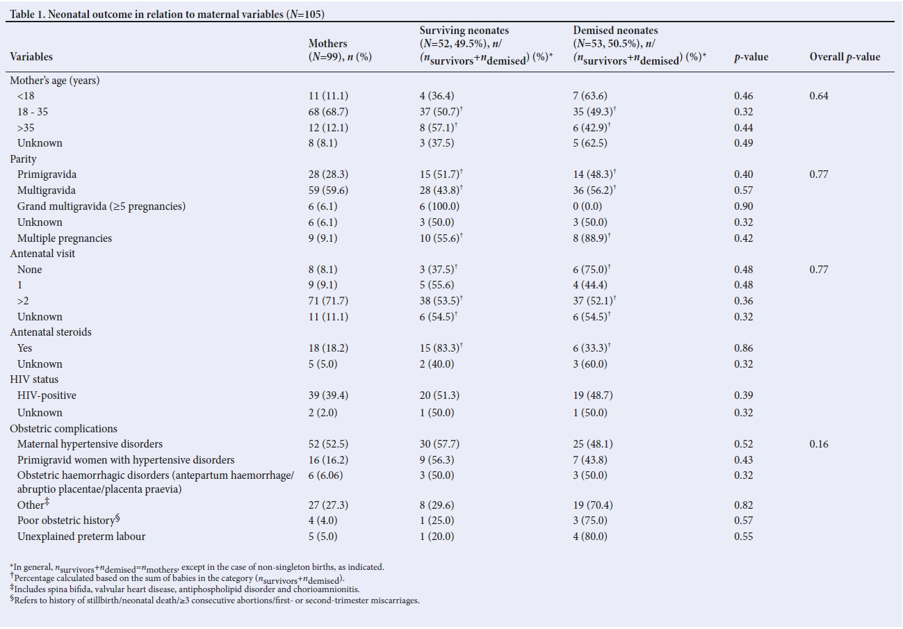 More than two-thirds of the mothers (n =71; 71.7%) had visited an antenatal clinic twice or more during their pregnancy, whereas eight did not attend an antenatal clinic at all. Antenatal history was unknown for 11 mothers. Records showed that only 18 mothers had received antenatal steroids. Hypertensive disorders had been recorded for approximately half the group (n =52; 52.5%), 16 of whom were primigravid. Obstetric haemorrhagic disorders were recorded in six cases. Of the 99 mothers, 39 (39.4%) were HIV infected.