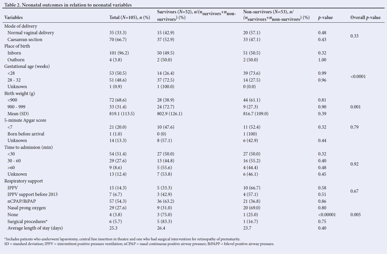 RESULTS. A total of 142 neonates met the inclusion criteria. Owing to lost files or incomplete data, 105 files were analysed in the final sample. The mean birth weight was 819.1 g and the mean gestational age was 27.5 weeks. The survival rate to discharge was 49.5%. Neonates born after 28 weeks of gestation and those with a birth weight of >900 g had better outcomes but without statistical significance. There were no statistically significant associations between outcome and any maternal variables. Nasal continuous positive airway pressure ventilation was associated with higher survival, but without statistical significance.