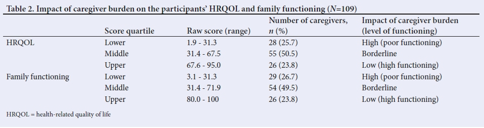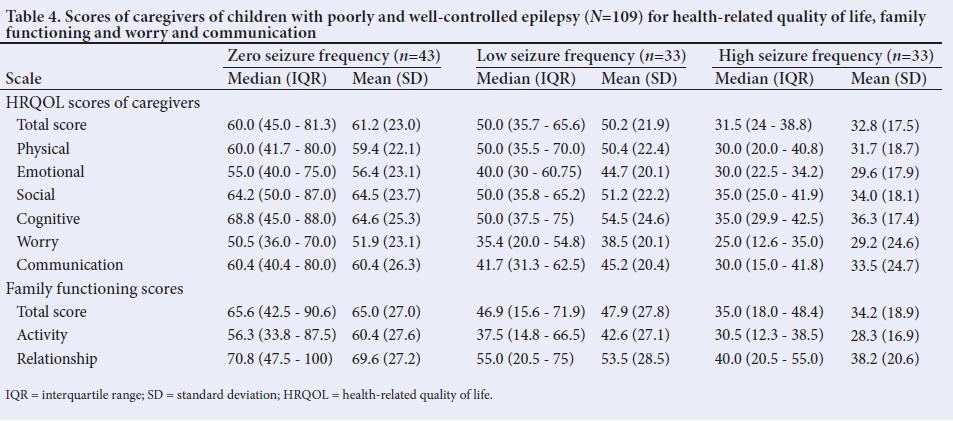 METHOD. A cross-sectional study was conducted among primary caregivers of CWE attending the Charlotte Maxeke Johannesburg Academic Hospital, South Africa. Participants had been involved in childcare for at least 6 months before study enrolment and all gave informed consent. Data regarding sociodemographic and epilepsy-related variables were obtained from questionnaires, including the 36-item family impact module of the Pediatric Quality of Life assessment tool. Scores in the lower quartile were considered indicative of a negative impact on HRQOL and poor family functioning.