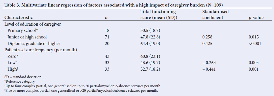 Multivariate linear regression analysis confirmed level of education of caregiver and seizure frequency as independent predictors of the total functioning score of the caregivers (Table 3). Caregivers with tertiary-level education (diploma or higher) had significantly higher total functioning scores (mean 64.4) than caregivers with only primary education (mean 30.5; p<0.001). The total functioning score of caregivers was significantly lower in those who cared for children with a high seizure frequency (mean 32.7) than in those who cared for children who did not experience a seizure during the preceding 3 months (mean 60.8; p<0.001). Both level of education and seizure frequency showed a dose-response relationship with the total functioning score of the caregiver.