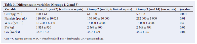 The mean CRP level of the infants in the septic group (Groups 1+2) was 87.4 ± 62.3 µg/mL compared with 5.2 ± 8 µg/mL (p=0.001) in Group 3. The platelet counts were significantly lower in infants in Group 1 compared with Group 2 and the platelet counts in Group 2 were significantly lower than in Group 3. There were no differences in the total WBC count among all three groups. The mean platelet count of the septic group (1+2) was lower than in Group 3: 132 700 ± 15 200/µL v. 212 000 ± 5 000/µL (p=0.0001). These data suggest that platelet counts were significantly lower and CRP levels higher in infants with sepsis (Groups 1 and 2) than in infants who had no sepsis (Group 3). We studied leukopenia (WBC <5 000/µL) and leukocytosis (WBC >30 000/µL) as markers of infection. The sensitivity and specificity of leukopenia (WBC <5 000/µL) was 1.82% and 93.86%, respectively while the sensitivity and specificity of leukocytosis (WBC >30 000/µL) were 7.27% and 94.74%, respectively.