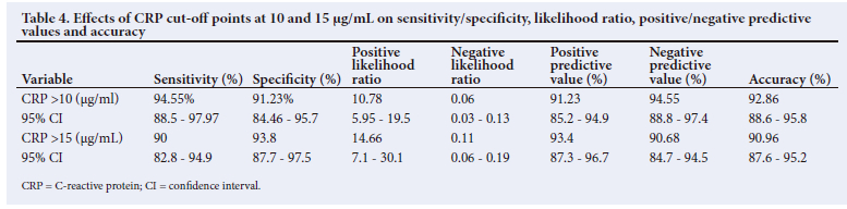 We used two cut-off points for the CRP to determine the sensitivity and specificity at these two levels. Table 4 shows the sensitivity, specificity, positive and negative likelihood ratios, positive and negative predictive values, and accuracy for CRP values >10/µg/mL), and >15 µg/mL.