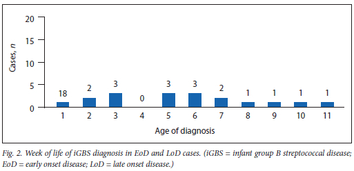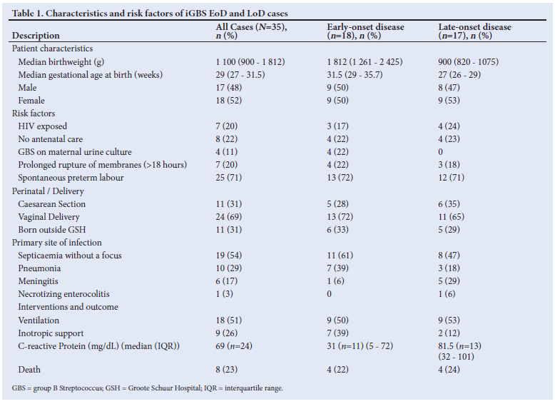 RESULTS: Thirty-five cases of iGBS were included in the study, 51% with early-onset disease (EoD) and 49% with late-onset disease (LoD). The median gestational age at birth was 27 and 31.5 weeks in the LoD and EoD groups, respectively. The median birth weight was 900 g and 1 812 g in the LoD and EoD groups, respectively. Meningitis was more common in the LoD group and pneumonia was more common in the EoD group. The overall mortality rate was 23%, with similar mortality rates in the EoD and LoD groups (22% and 24%, respectively). Invasive GBS disease accounted for a cumulative 274 intensive care unit days during the study period