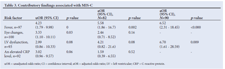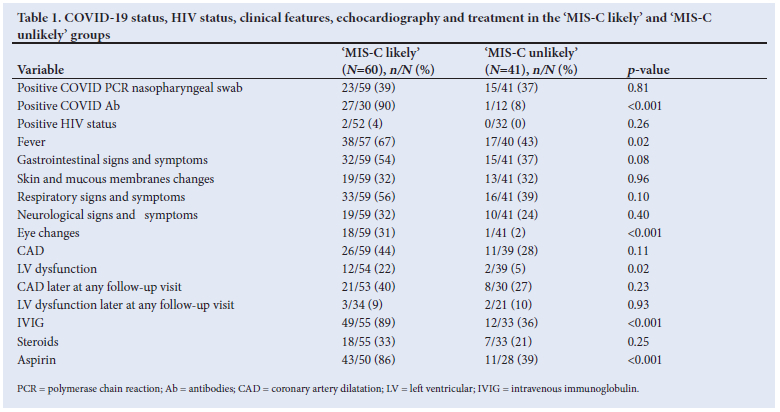 RESULTS: A total of 101 patients were analysed, with 60 in the 'MlS-C likely' group and 41 patients in the 'MlS-C unlikely' group. The significant clinical features differentiating between the 'MlS-C likely' and the 'MlS-C unlikely' groups were the presence of documented fever (p=0.018) and eye changes (p<0.001). Patients with a positive COVlD antibody test that were referred for suspected MlS-C were most likely to present with MlS-C (p< 0.001). Laboratory parameters suggesting a greater likelihood of patients having MlS-C was a high troponin T (p=0.018) and a high C-reactive protein (CRP) (p=0.019). The main echocardiographic feature associated with a MlS-C diagnosis was left ventricular (LV) dysfunction at presentation (p=0.023). ln the adjusted logistic regression analyses, the contributory findings associated with a greater risk of having MlS-C were fever and LV dysfunction (OR 6.52 (95% Cl 2.31 - 18.45); p<0.001 and 6.70 (95% confidence interval (Cl) 1.61 - 28.59); p =0.009, respectively