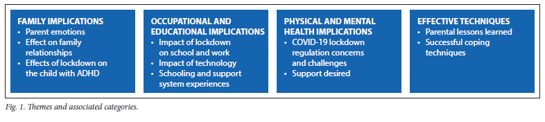 Interviews were anonymised using a data management code recording the gender of the parent, date of the interview, child's grade in 2020 and child's gender. Interviews were transcribed by the researcher and analysed using an inductive thematic approach with an interpretivist paradigm to interpret participants' experiences during lockdown. Interview transcriptions were read by a second coder for peer reviewing and institutional checking. [23] Trustworthiness was established by aligning the interpretation process according to data triangulation and external checking of transcripts. Researcher bias was limited because lockdown restrictions were never experienced before 2020. The researcher's professional and personal experience of children with ADHD was of pre-COVID-19 parental experiences, strategies and presentation of ADHD. Trustworthiness was attained through the detailed capturing and quoting of participants, and by recording the features of ADHD and the specific context of COVID-19 in SA through literature referencing.