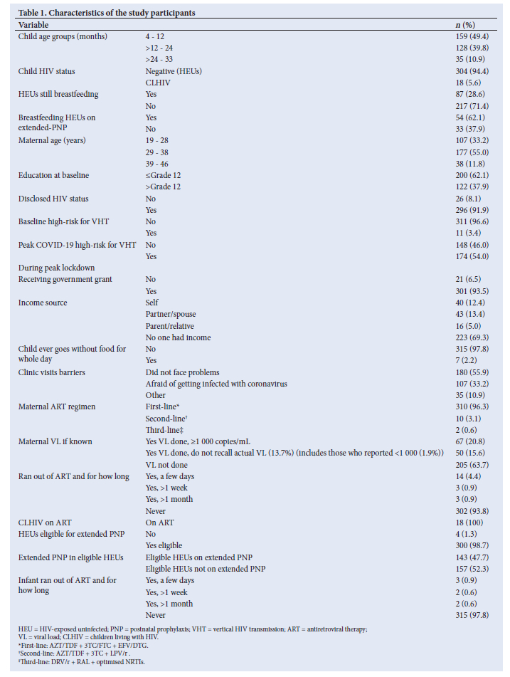 The characteristics of the interviewed sample are summarised in Table 1. Among the 322 WLHIV interviewed telephonically, maternal age ranged between 19 and 46 years during the peak lockdown period. Many households (69%) had no one with an active income during the study period besides receiving the COVID-19 government relief grant (93.5%). Just over half (55.9%) of the women reported not facing barriers to visiting the clinic during the peak lockdown period. The cited clinic barriers in the remainder 44.1% (n/N=142/322) included fear of getting the coronavirus, long clinic queues, closed clinics, fear of visiting distant clinics owing to the lock-down enforcement. Most women (96.3%) were on first-line ART regimen and had disclosed their HIV status to someone (92%). Less than 30% of women with VL test done in the past 6 months had a VL >1 000 copies/mL and most (63.7%) had no VL test done. During this peak lockdown period, about 6% of the women ran out of ART, with less than 2% going without treatment for more than a week, and among these 70% (n/N=14/20) were women who reported facing barriers to visiting the clinic during peak lockdown period. We explored a potential relationship between clinic visit barriers and selected factors (Supplementary File 2). The distribution of clinic visits barriers varied significantly by infant HIV and treatment status and mother's VL (p<0.001). Regarding antiretroviral access, all mothers who reported their infants running out of medication cited fear of COVID-19 infection as a barrier, while 57.1% of those who never ran out reported no barriers (p=0.001).