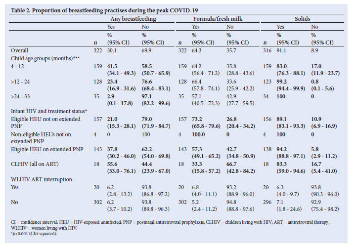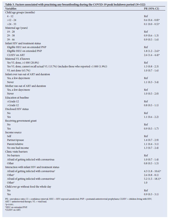 METHODS. A cross-sectional telephonic survey was conducted (September to November 2020), among women living with HIV (WLHIV) from rural Ehlanzeni District, South Africa (SA). Participants who were previously enrolled in a face-to-face study during 2019 and who provided consent for future studies, were invited to take part in the present survey. Data, including child feeding practices, were collected from maternal recall of the COVID-19 pandemic peak lockdown period. Descriptive statistics were calculated and factors associated with breastfeeding were analysed using log binomial regression.