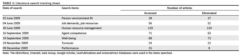 This data was found primarily in e-journals located in databases such as EBSCOhost (Academic Search Premier, Business Source Premier and PsycInfo), Emerald, Gale Group (RDS Business & Management Practices), SAePublications and ScienceDirect that covers business, management and multidisciplinary subjects. EBSCOhost, through which the majority of the articles were found, is an academic and business resource boasting a powerful search engine that provides online access to full text collections of thousands of e-journals as well as more than 100 indexing and abstracting databases. Admittance to these databases was facilitated through the http://www.uj.ac.za/library web portal. Table 1 details the literature search-tracking sheet that was used to record the number of articles accessed for each search item.
