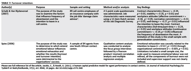 Most of the studies found in the initial literature review focused only on a particular purpose, namely on agent and/ or business performance. Examples included the impact of satisfaction on retention resulting in higher experience levels that lead to better performance; job demands-resources linked to performance; emotional intelligence linked to agent performance; and management of quantitative performance at the cost of overall performance (Aksin, Armony & Mehrotra, 2007; Dwyer & Fox, 2006; Higgs, 2004; Nel & De Villiers, 2004; Robinson & Morley, 2006). Other research mostly concentrated on elements of the interaction between operations and human resources (Aksin et al., 2007) such as the trade-off between efficiency and quality; staffing problems with learning and turnover; and staffing problems with absenteeism and random demand.