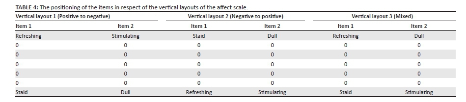 The six different layouts of the affect scale consisted of three horizontal layouts (representing horizontal spatial orientation; see Table 3) and three vertical layouts (representing vertical spatial orientation; see Table 4). Each item in the three horizontal layouts of the scale consisted of two bipolar adjectives, one positioned on the left and the other on the right of the continuum. In the positive to negative horizontal layout (horizontal layout 1), the positive adjective was positioned on the left of the continuum and the negative adjective was placed on the right side of the continuum. For the negative to positive horizontal layout (horizontal layout 2), the positioning was reversed with the negative adjective on the left and the positive adjective on the right of the continuum. A combination of the positioning of the items in the aforementioned layouts was used in the mixed horizontal layout (horizontal layout 3).