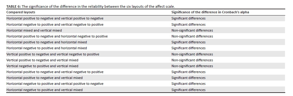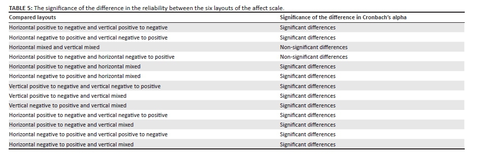 A pairwise comparison of the Cronbach's alpha reliability coefficients were done by means of Feldt's test of differences in independent reliability coefficients (Charter & Feldt, 1996; see Table 5). Only two comparisons were statistically non-significant (p > 0.05), namely, that of the horizontal layout 1 (a = 0.927) and horizontal layout 2 (a = 0.924), and that of horizontal layout 3 (a = 0.884) and vertical layout 3 (a = 0.864). This suggests that differences in the reliability coefficients between these layouts may not be due to the spatial positioning of emotionally charged adjectives.