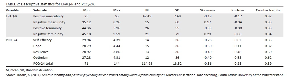 Ethical clearance was obtained from the University of the Witwatersrand Ethics Committee. Once obtained, respondents were sourced within organisations, from the social media platform of LinkedIn and from WitsPlus. With regard to organisations, permission was granted from Human Resource (HR) managers and/or HR Directors for the questionnaire to be electronically distributed to employees. Organisations were predominantly sourced from the retail, educational and financial sectors. Once permission was granted, the HR Manager (or relevant Director) sent an email to all employees, which contained an invitation to participate in the study and an encrypted link enabling access to this questionnaire. With regard to social media, a request for participation was posted on South African LinkedIn pages for South African individuals who fulfilled the participation criteria. The posts requested individuals who fulfilled the participation criteria to click on the encrypted link to participate. With regard to WitsPlus, permission was obtained from the WitsPlus course coordinator to approach WitsPlus students. WitsPlus students are individuals who are enrolled in part-time evening classes at the University of the Witwatersrand, studying towards a degree. All of these individuals are in full-time employment. To facilitate electronic collection of data, a composite questionnaire was created on the website Survey Monkey. This online questionnaire included a cover letter, biographical questions and the EPAQ-R and PCQ-24. The cover letter, provided to all participants, briefly outlined the purpose of the study, expected participation time, informed prospective respondents that participation was voluntary, that there were no disadvantages and/or risks for participating and that respondents could withdraw from the study at any point prior to submitting their responses, with submission being regarded as informed consent. The cover letter also stated that each participating organisation would receive a summarised report of the entire study, but no organisation or individual could be identified in the summary. This letter also stated that as no identifying information would be collected, all responses would be anonymous. Thus, ethical requirements were deemed to have been met.