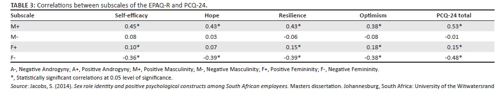 Table 3 indicates significant positive moderate to strong correlations between the positive masculine subscale and self-efficacy (0.45), hope (0.43), resilience (0.43), optimism (0.38) and PsyCap (0.53). For positive femininity, there was a significant positive, albeit low correlation to self-efficacy (0.10), resilience (0.15), optimism (0.18) and overall PsyCap (0.15). Scores on the negative masculine subscale had no significant correlations to any PsyCap subscales. The negative femininity subscale had significantly moderate to strong inverse correlations to self-efficacy (−0.36), hope (−0.39), resilience (−0.39), optimism (−0.38) and overall PsyCap (−0.48).