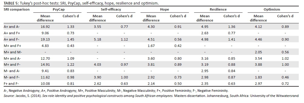 Given that all the ANOVAs were significant, Tukey's post-hoc tests were conducted to determine which means were significantly different from one another for PsyCap and its subscales. Significant differences between SRIs are presented in Table 5.